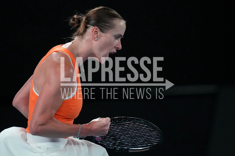 Elina Svitolina of Ukraine reacts during her quarterfinal match against Coco Gauff of the U.S. during their quarterfinal match at the Australian Open tennis championship in Melbourne, Australia, Tuesday, Jan. 27, 2026. (AP Photo/Asanka Brendon Ratnayake)