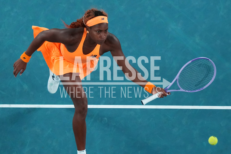 Coco Gauff of the U.S. plays a forehand return to Elina Svitolina of Ukraine during their quarterfinal match at the Australian Open tennis championship in Melbourne, Australia, Tuesday, Jan. 27, 2026. (AP Photo/Aaron Favila)