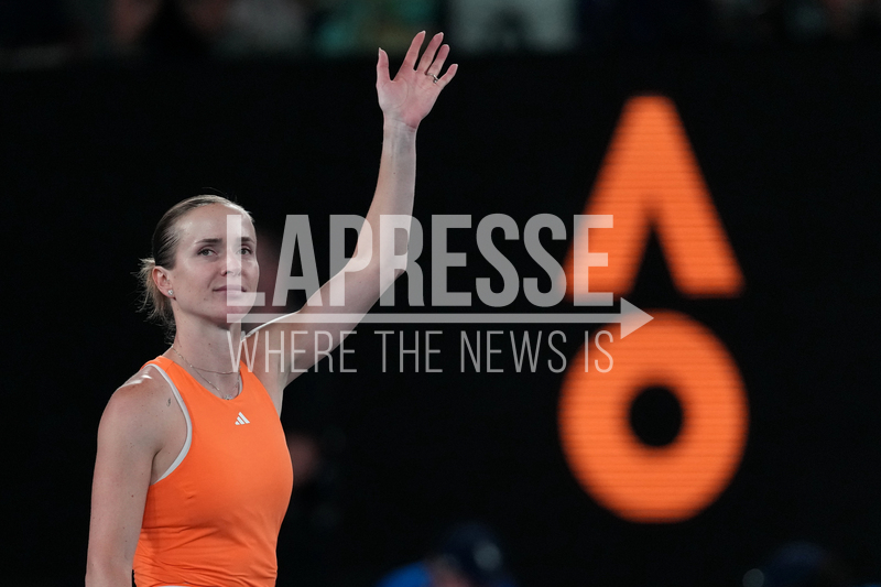 Elina Svitolina of Ukraine celebrates after defeating Coco Gauff of the U.S. in their quarterfinal match at the Australian Open tennis championship in Melbourne, Australia, Tuesday, Jan. 27, 2026. (AP Photo/Dita Alangkara)