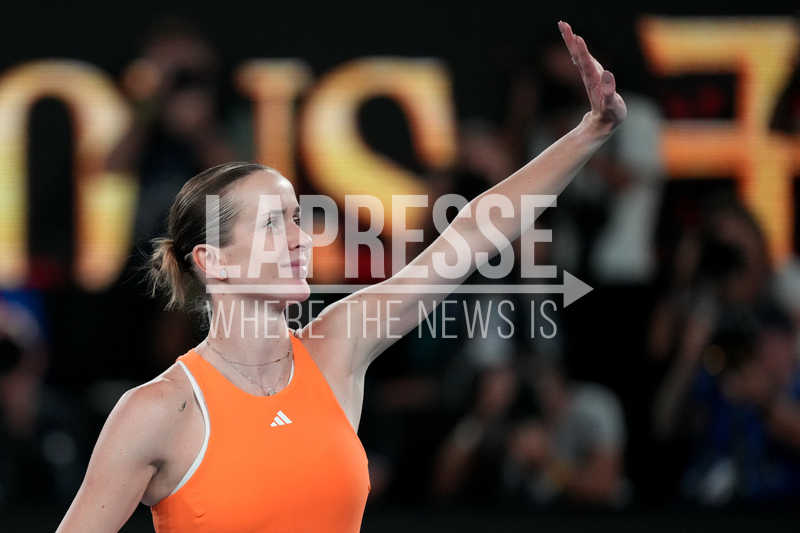 Elina Svitolina of Ukraine celebrates after defeating Coco Gauff of the U.S. in their quarterfinal match at the Australian Open tennis championship in Melbourne, Australia, Tuesday, Jan. 27, 2026.. (AP Photo/Asanka Brendon Ratnayake)