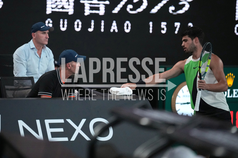Carlos Alcaraz, right, of Spain talks to his coaches during his quarterfinal against Alex de Minaur of Australia at the Australian Open tennis championship in Melbourne, Australia, Tuesday, Jan. 27, 2026. (AP Photo/Dita Alangkara)
