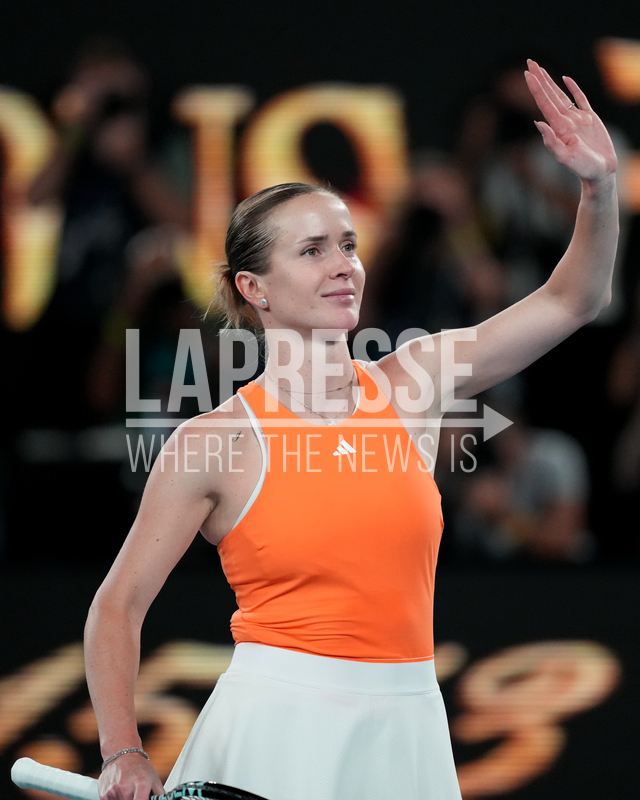 Elina Svitolina of Ukraine celebrates after defeating Coco Gauff of the U.S. in their quarterfinal match at the Australian Open tennis championship in Melbourne, Australia, Tuesday, Jan. 27, 2026. (AP Photo/Dar Yasin)