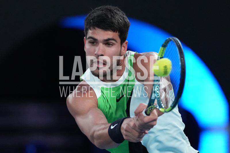 Carlos Alcaraz of Spain plays a backhand return to Alex de Minaur of Australia during their quarterfinal match at the Australian Open tennis championship in Melbourne, Australia, Tuesday, Jan. 27, 2026. (AP Photo/Asanka Brendon Ratnayake)