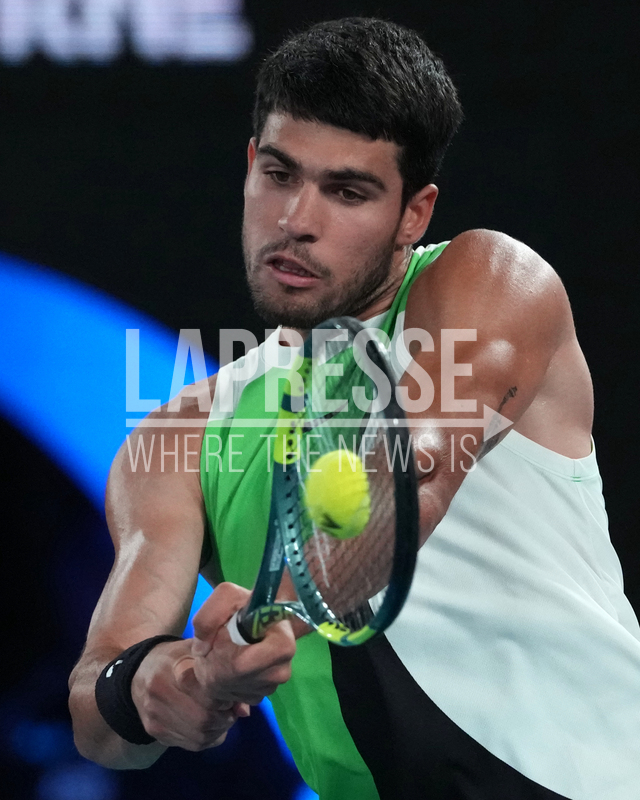 Carlos Alcaraz of Spain plays a backhand return to Alex de Minaur of Australia during their quarterfinal match at the Australian Open tennis championship in Melbourne, Australia, Tuesday, Jan. 27, 2026. (AP Photo/Asanka Brendon Ratnayake)