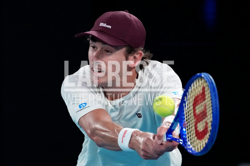 Alex de Minaur of Australia plays a backhand return to Carlos Alcaraz of Spain during their quarterfinal match at the Australian Open tennis championship in Melbourne, Australia, Tuesday, Jan. 27, 2026. (AP Photo/Aaron Favila)