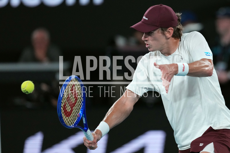 Alex de Minaur of Australia plays a backhand return to Carlos Alcaraz of Spain during their quarterfinal match at the Australian Open tennis championship in Melbourne, Australia, Tuesday, Jan. 27, 2026. (AP Photo/Asanka Brendon Ratnayake)
