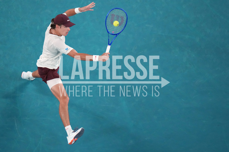 Alex de Minaur of Australia plays a backhand return to Carlos Alcaraz of Spain during their quarterfinal match at the Australian Open tennis championship in Melbourne, Australia, Tuesday, Jan. 27, 2026. (AP Photo/Dar Yasin)