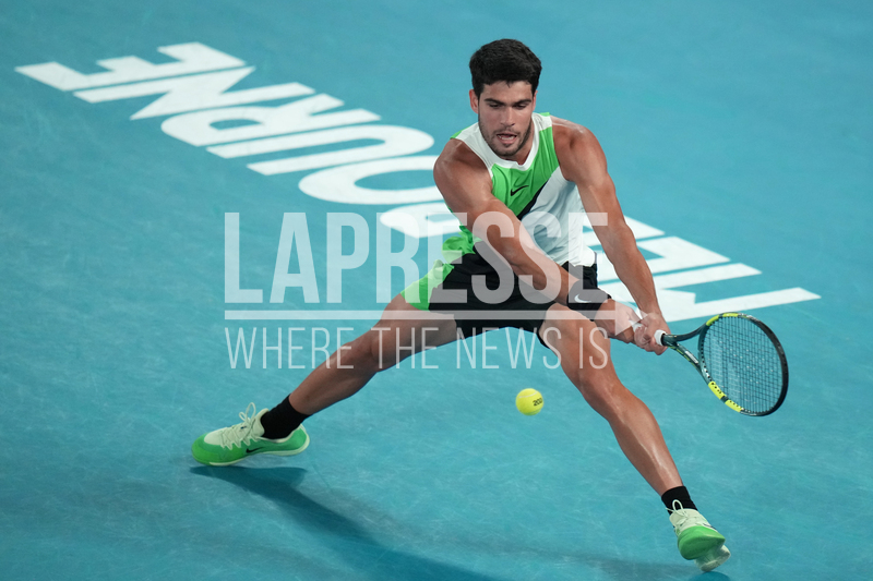 Carlos Alcaraz of Spain plays a backhand return to Alex de Minaur of Australia during their quarterfinal match at the Australian Open tennis championship in Melbourne, Australia, Tuesday, Jan. 27, 2026. (AP Photo/Dar Yasin)