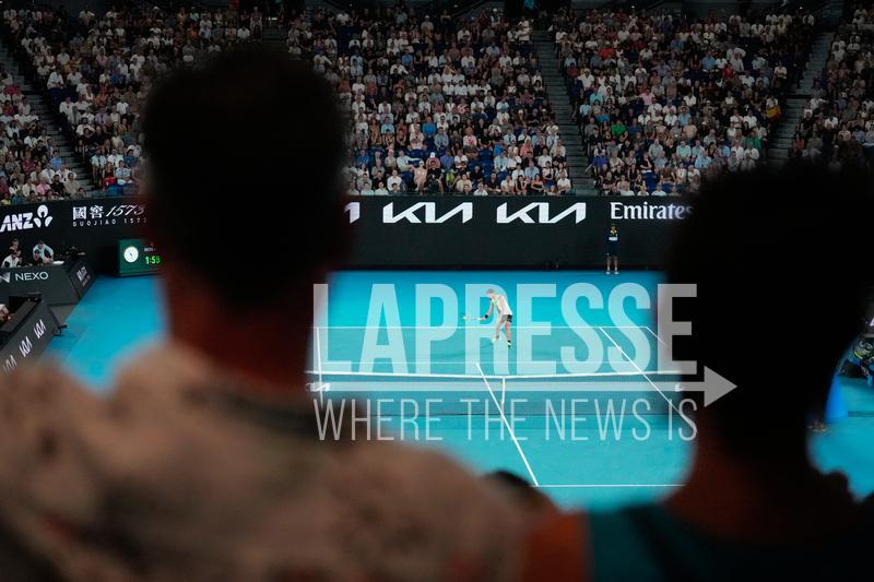 Carlos Alcaraz of Spain plays a forehand return to Alex de Minaur of Australia during their quarterfinal match at the Australian Open tennis championship in Melbourne, Australia, Tuesday, Jan. 27, 2026. (AP Photo/Dar Yasin)