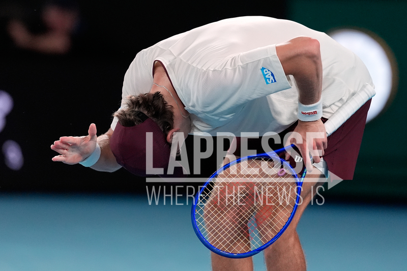 Alex de Minaur of Australia reacts during his quarterfinal match against Carlos Alcaraz of Spain at the Australian Open tennis championship in Melbourne, Australia, Tuesday, Jan. 27, 2026. (AP Photo/Asanka Brendon Ratnayake)