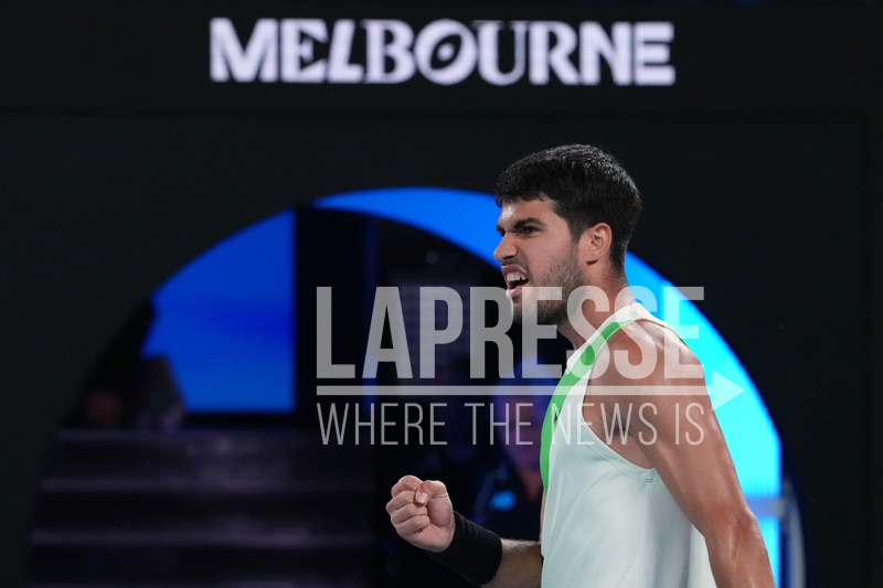 Carlos Alcaraz of Spain reacts during his quarterfinal match against Alex de Minaur of Australia at the Australian Open tennis championship in Melbourne, Australia, Tuesday, Jan. 27, 2026. (AP Photo/Asanka Brendon Ratnayake)