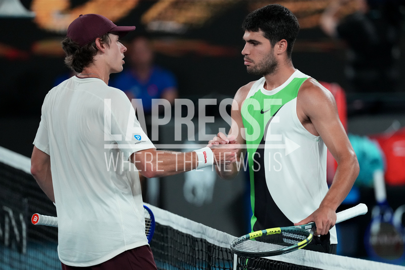 Carlos Alcaraz, right, of Spain is congratulated by Alex de Minaur, left, of Australia following their quarterfinal match at the Australian Open tennis championship in Melbourne, Australia, Tuesday, Jan. 27, 2026. (AP Photo/Dita Alangkara)