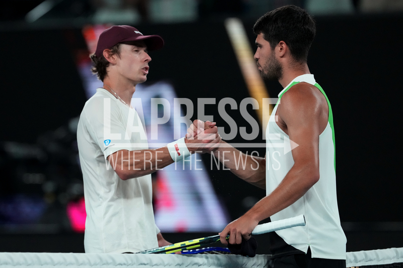 Carlos Alcaraz, right, of Spain is congratulated by Alex de Minaur, left, of Australia following their quarterfinal match at the Australian Open tennis championship in Melbourne, Australia, Tuesday, Jan. 27, 2026. (AP Photo/Aaron Favila)