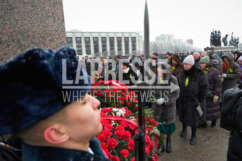 People place flowers during a commemoration ceremony at the monument of the Heroic Defenders of Leningrad during celebration of the 82nd anniversary of the World War II battle that lifted the Nazi siege of Leningrad (now St. Petersburg), in St. Petersburg, Russia, Tuesday, Jan. 27, 2026. (AP Photo/Dmitri Lovetsky)