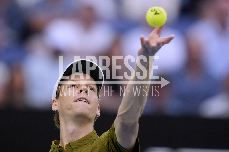 Jannik Sinner of Italy serves to Ben Shelton of the U.S. during their quarterfinal match at the Australian Open tennis championship in Melbourne, Australia, Wednesday, Jan. 28, 2026. (AP Photo/Asanka Brendon Ratnayake)