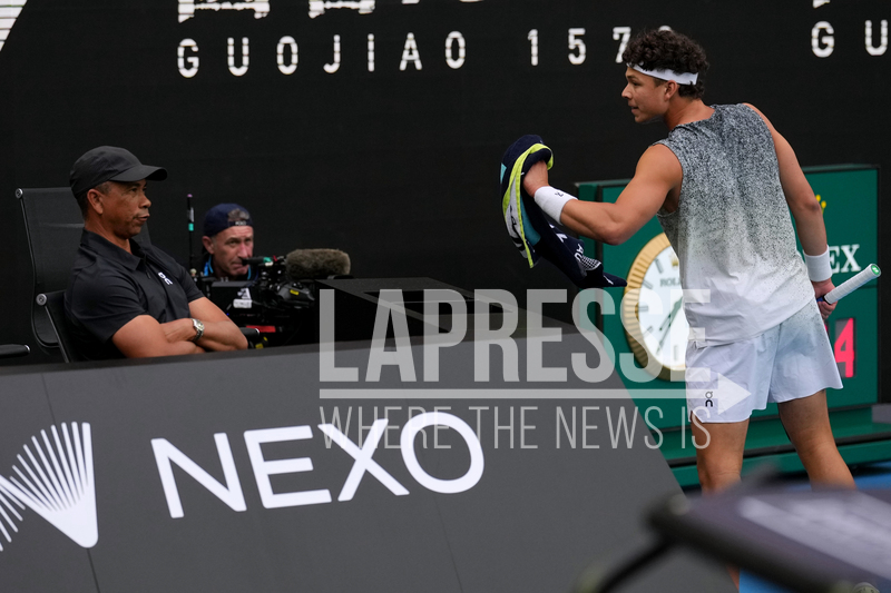 Ben Shelton of the U.S. talks to his coach and father Bryan Shelton, left, during his quarterfinal against Jannik Sinner of Italy at the Australian Open tennis championship in Melbourne, Australia, Wednesday, Jan. 28, 2026. (AP Photo/Dita Alangkara)