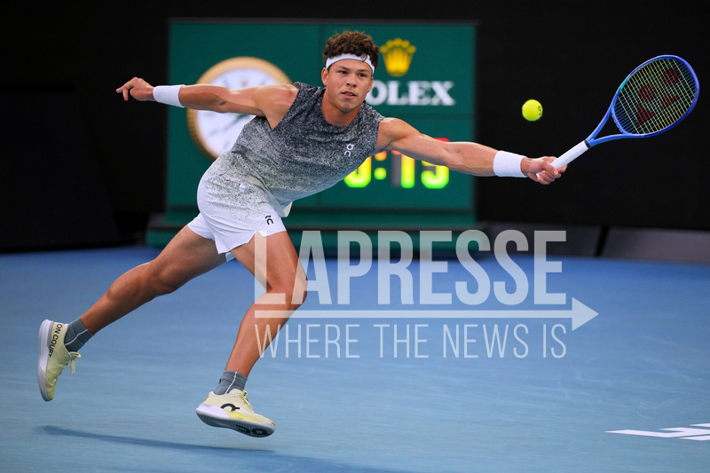 Ben Shelton of the U.S. plays a forehand return to Jannik Sinner of Italy during their quarterfinal match at the Australian Open tennis championship in Melbourne, Australia, Wednesday, Jan. 28, 2026. (AP Photo/Dita Alangkara)