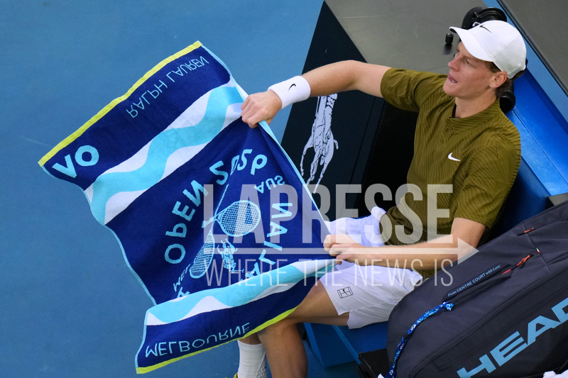 Jannik Sinner of Italy rests between games during his quarterfinal against Ben Shelton of the U.S. at the Australian Open tennis championship in Melbourne, Australia, Wednesday, Jan. 28, 2026. (AP Photo/Dar Yasin)