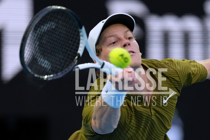Jannik Sinner of Italy plays a forehand return to Ben Shelton of the U.S. during their quarterfinal match at the Australian Open tennis championship in Melbourne, Australia, Wednesday, Jan. 28, 2026. (AP Photo/Asanka Brendon Ratnayake)