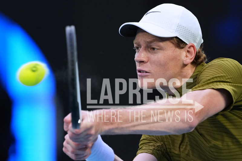 Jannik Sinner of Italy plays a backhand return to Ben Shelton of the U.S. during their quarterfinal match at the Australian Open tennis championship in Melbourne, Australia, Wednesday, Jan. 28, 2026. (AP Photo/Aaron Favila)