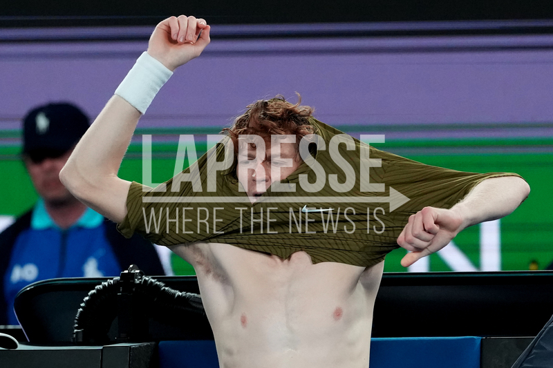 Jannik Sinner of Italy changes his shirt during his quarterfinal match against Ben Shelton of the U.S. during their quarterfinal match at the Australian Open tennis championship in Melbourne, Australia, Wednesday, Jan. 28, 2026. (AP Photo/Aaron Favila)
