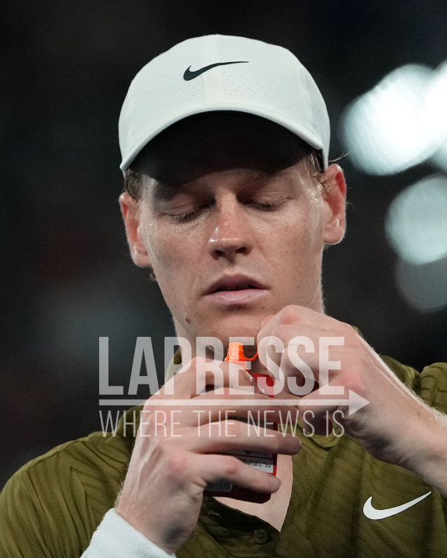 Jannik Sinner of Italy prepares to take a drink during his quarterfinal match against Ben Shelton of the U.S. during their quarterfinal match at the Australian Open tennis championship in Melbourne, Australia, Wednesday, Jan. 28, 2026. (AP Photo/Asanka Brendon Ratnayake)