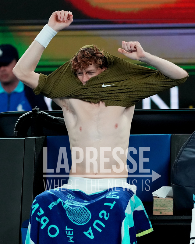 Jannik Sinner of Italy changes his shirt during his quarterfinal match against Ben Shelton of the U.S. during their quarterfinal match at the Australian Open tennis championship in Melbourne, Australia, Wednesday, Jan. 28, 2026. (AP Photo/Aaron Favila)