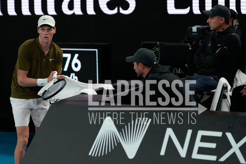 Jannik Sinner of Italy talks to his team during his quarterfinal match against Ben Shelton of the U.S. at the Australian Open tennis championship in Melbourne, Australia, Wednesday, Jan. 28, 2026. (AP Photo/Aaron Favila)