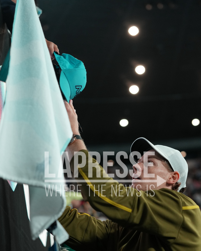 Jannik Sinner of Italy signs autographs after defeating Ben Shelton of the U.S. in their quarterfinal match at the Australian Open tennis championship in Melbourne, Australia, Wednesday, Jan. 28, 2026. (AP Photo/Asanka Brendon Ratnayake)