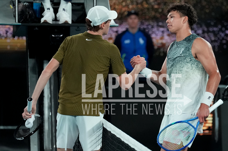 Jannik Sinner, left, of Italy is congratulated by Ben Shelton, right, of the U.S. following their quarterfinal match at the Australian Open tennis championship in Melbourne, Australia, Wednesday, Jan. 28, 2026. (AP Photo/Dita Alangkara)