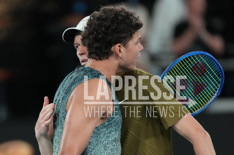Jannik Sinner of Italy is congratulated by Ben Shelton, left, of the U.S. following their quarterfinal match at the Australian Open tennis championship in Melbourne, Australia, Wednesday, Jan. 28, 2026. (AP Photo/Asanka Brendon Ratnayake)