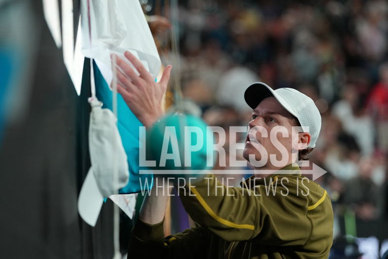 Jannik Sinner of Italy signs autographs after defeating Ben Shelton of the U.S. in their quarterfinal match at the Australian Open tennis championship in Melbourne, Australia, Wednesday, Jan. 28, 2026. (AP Photo/Asanka Brendon Ratnayake)