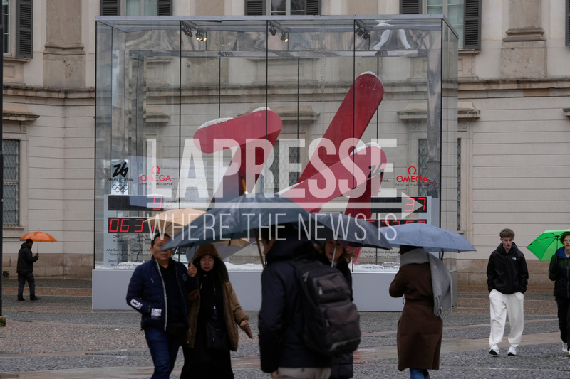 People walk in the rain in front of the Milan Cortina Winter Olympic countdown watch, in Milan, Italy, Wednesday, Jan. 28, 2026. (AP Photo/Luca Bruno)