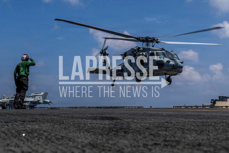 This handout image from the U.S. Navy shows Capt. Daniel Keeler, the commanding officer of the Nimitz-class aircraft carrier USS Abraham Lincoln, flying an MH-60R Sea Hawk helicopter in the Indian Ocean on Jan. 23, 2026. (Mass Communication Specialist Seaman Daniel Kimmelman/U.S. Navy via AP)
