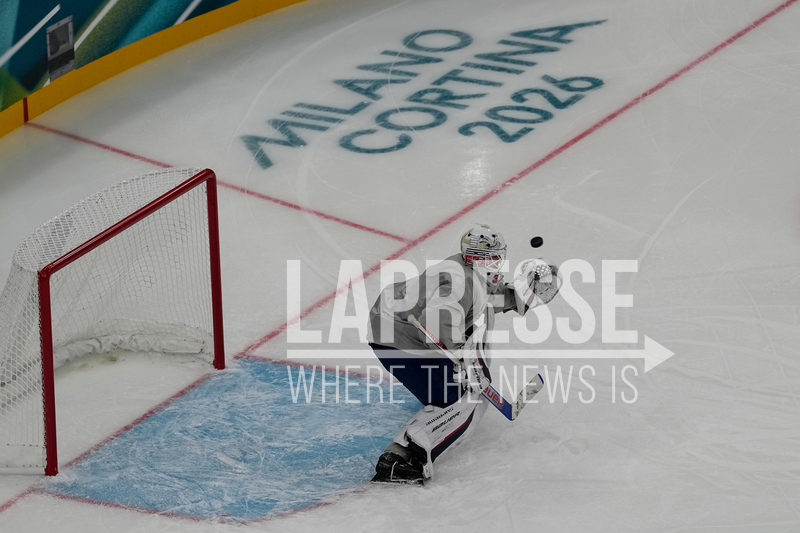 A France ice hockey goalkeeper makes a save during a training session ahead of the 2026 Winter Olympics in Milan, Italy, Tuesday, Feb. 3, 2026. (AP Photo/Hassan Ammar)