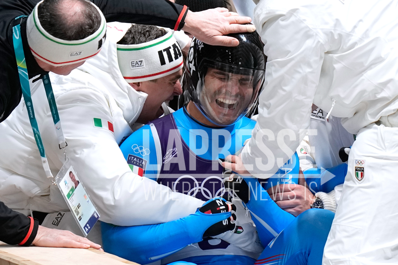 Italy's Emanuel Rieder and Simon Kainzwaldner celebrate as they arrive at the finish during a men's doubles luge run at the 2026 Winter Olympics, in Cortina d'Ampezzo, Italy, Wednesday, Feb. 11, 2026. (AP Photo/Aijaz Rahi)