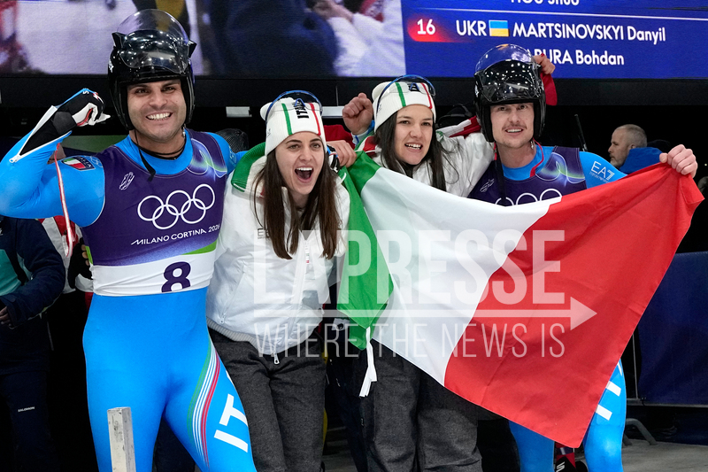From left, Italy's gold medalists Emanuel Rieder, Andrea Voetter, Marion Oberhofer and Simon Kainzwaldner, celebrate after the men's and women's doubles luge competitions at the 2026 Winter Olympics, in Cortina d'Ampezzo, Italy, Wednesday, Feb. 11, 2026. (AP Photo/Alessandra Tarantino)