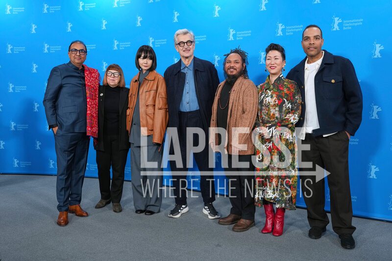 Jury members, Shivendra Singh Dungarpur, from left, Ewa Puszczynska, Bae Doona, Jury president Wim Wenders, Min Bahadur Bham, Mitsuyo Miyazaki and Reinaldo Marcus Green pose for photographers at the photo call for the Jury of the International Film Festival, Berlinale, in Berlin, Thursday, Feb. 12, 2026. (Photo by Scott A Garfitt/Invision/AP).