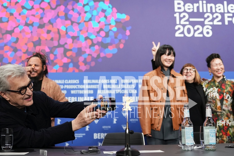 Jury president Wim Wenders, left, takes a photograph of Bae Doona, Ewa Puszczynska and Mitsuyo Miyazaki, also known as HIKARI at the press conference for the Jury of the International Film Festival, Berlinale, in Berlin, Thursday, Feb. 12, 2026. (Photo by Scott A Garfitt/Invision/AP).