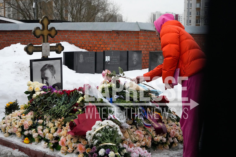 A woman lays flowers at the grave of Russian opposition leader Alexei Navalny, two years after his death, at the Borisovskoye Cemetery in Moscow, on Monday, Feb. 16, 2026. (AP Photo/Alexander Zemlianichenko)