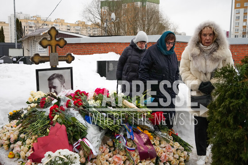 Late Russian opposition leader Alexei Navalny's mother Lyudmila Navalnaya, second right, and his mother-in-law Alla Abrosimova, right, walk next to his grave, two years after his death, at the Borisovskoye Cemetery in Moscow, on Monday, Feb. 16, 2026. (AP Photo/Alexander Zemlianichenko)