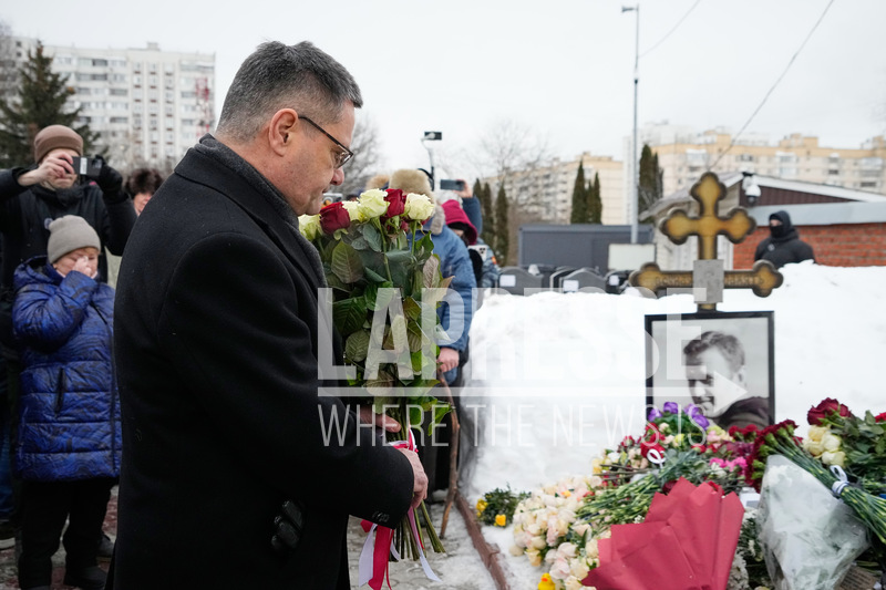 A Polish diplomat lays flowers at the grave of Russian opposition leader Alexei Navalny, two years after his death, at the Borisovskoye Cemetery in Moscow, on Monday, Feb. 16, 2026. (AP Photo/Alexander Zemlianichenko)