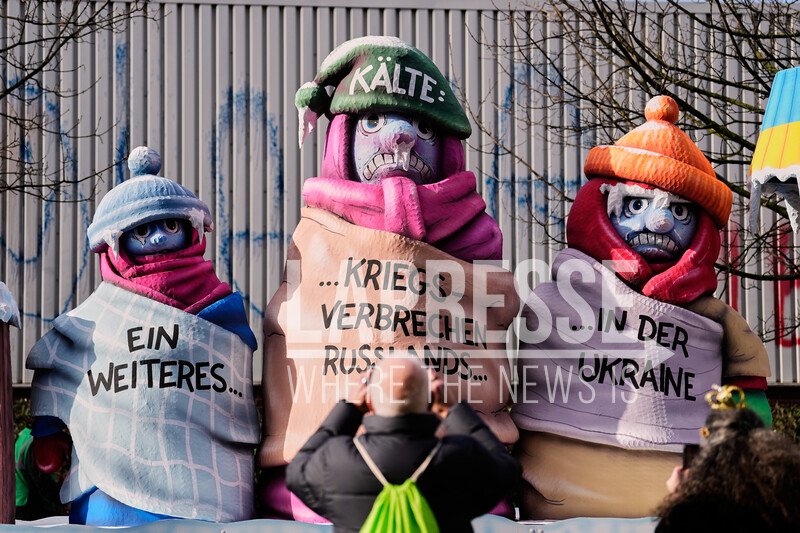 A carnival float with letters reading " Cold, another war crime in Ukraine" is seen during the Rosemonday Carnival Parade in Duesseldorf, Germany, Monday, Feb. 16, 2026 (AP Photo/Martin Meissner)