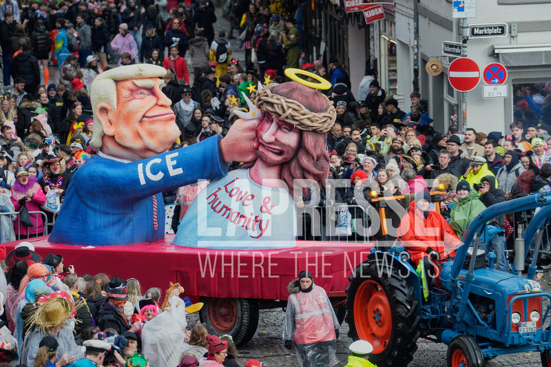 A carnival float depicting US President Donald Trump is seen during the Rosemonday Carnival Parade in Duesseldorf, Germany, Monday, Feb. 16, 2026 (AP Photo/Martin Meissner)