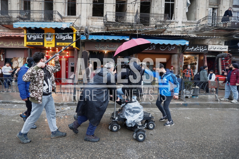 A television crew films an episode of the TV series "Al-Souriyoun al-Aada" ("The Syrian Enemies"), based on a novel of the same name that was banned under Bashar Assad, along a transformed street in central Aleppo, Syria, Friday, Feb. 13, 2026. (AP Photo/Omar Sanadiki)