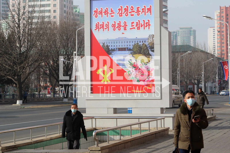 Pyongyang citizens walk in the street of the Central District in Pyongyang, North Korea Thursday, Feb. 26, 2026. A poster reads "Highest Glory to Respected Comrade Kim Jong Un."(AP Photo/Jon Chol Jin)