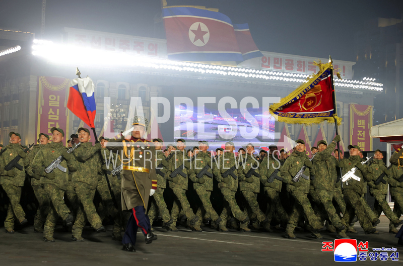 In this photo provided by the North Korean government, a soldier who was dispatched to Russia carries a Russian flag during a parade at Kim Il Sung Square in Pyongyang, North Korea Wednesday, Feb. 25, 2026 as the North wrapped up the Workers’ Party congress. Independent journalists were not given access to cover the event depicted in this image distributed by the North Korean government. The content of this image is as provided and cannot be independently verified. Korean language watermark on image as provided by source reads: "KCNA" which is the abbreviation for Korean Central News Agency. (Korean Central News Agency/Korea News Service via AP)