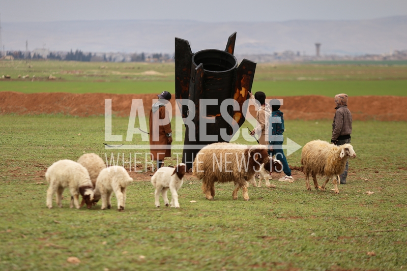 Exposing themselves to the danger of unexploded ordnance, shepherd boys inspect an unexploded Iranian missile that landed in an open field on the outskirts of Qamishli, eastern Syria, Wednesday, March 4, 2026. (AP Photo/Baderkhan Ahmad)