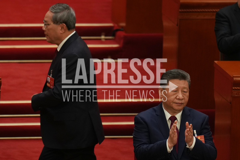 Chinese President Xi Jinping, right, applauds as Chinese Premier Li Qiang walks before delivering his report during the opening session of the National People's Congress (NPC) in Beijing, Thursday, March 5, 2026. (AP Photo/Ng Han Guan)