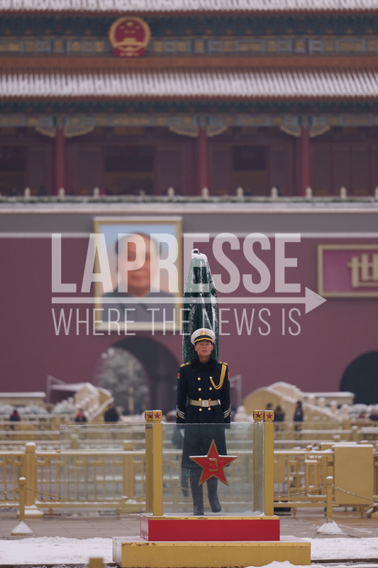 Paramilitary stands in front of the portrait of Mao Zedong at Tiananmen Gate before opening session of the National People's Congress (NPC) in Beijing, China, Thursday, March 5, 2026. (AP Photo/Vincent Thian)